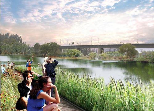 依托現(xiàn)狀地形地貌,打造親水平臺(tái),結(jié)合用地規(guī)劃打造條狀小游園。